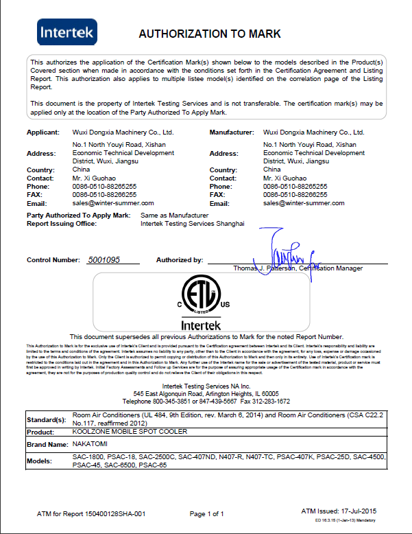 中欧在线平台-(中国)官方网站近日宣布公司移动式工业冷气机获得的质量与安全第三方机构天祥实验室(世界上规模的消费品测试、检验和认证公司之一)颁发的ETL认证。
